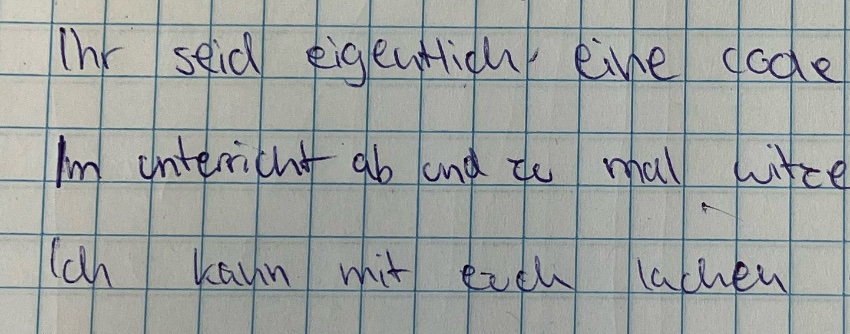 … durfte ich ein Gedicht lesen. Eine Schülerin aus dem siebten Jahrgang hat es für ihre Klasse geschrieben. Obwohl die Autorin stolz auf sich sein kann, möchte sie leider nicht genannt werden. Ihr könnt zwar manchmal nerven,Sachen durch die Klasse werfen,Regeln brechen ab und zu,uns´re Lehrer haben selten Ruh´. Aber dennoch seid ihr zum Ertragen,muss […]